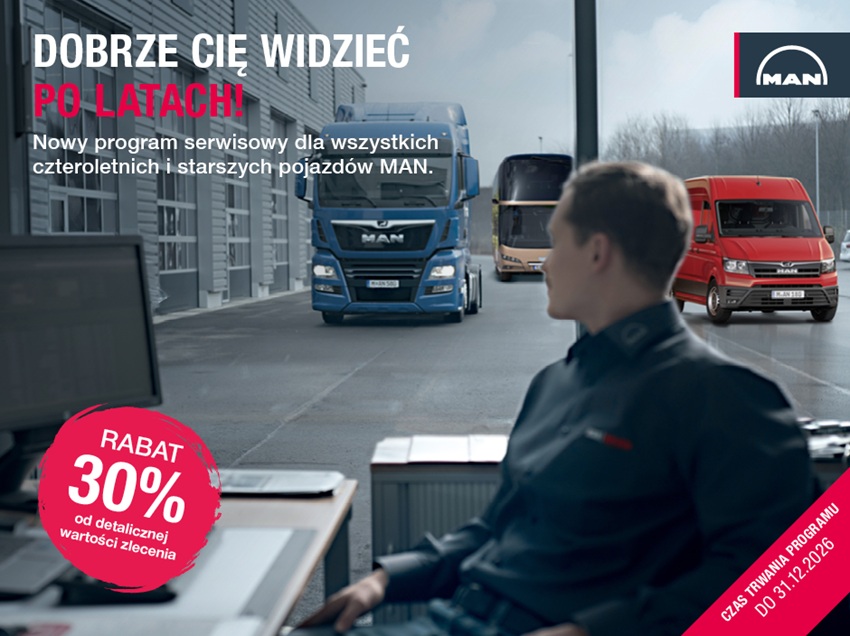 Dawno się nie widzieliśmy. Zapraszamy do nas, zapewnimy mu najlepszą opiekę, na jaką zasługuje! Przedstawiamy Ci nasz nowy program serwisowy, stworzony specjalnie dla pojazdów czteroletnich i starszych, dołącz do MAN ServiceCare i ciesz się kompleksową obsługą wykwalifikowanej kadry w Autoryzowanych Serwisach MAN w Polsce. Co zyskujesz? Rabat 30% od detalicznej wartości zlecenia (robocizna + oryginalne części MAN) Najlepszą jakość usług serwisowych Profesjonalną obsługę przez doświadczony zespół Pełne wsparcie techniczne i doradztwo