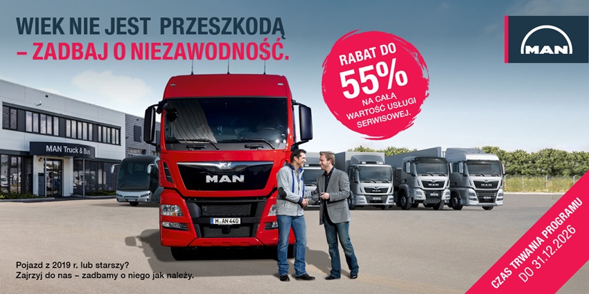 Twój pojazd został zarejestrowany w 2019 roku lub wcześniej? Zapraszamy do nas, zapewnimy mu najlepszą opiekę, na jaką zasługuje! Stworzyliśmy program serwisowy specjalnie dla pojazdów ośmioletnich i starszych, przyjedź do Autoryzowanego Serwisu MAN w Polsce i ciesz się kompleksową obsługą wykwalifikowanej kadry i niezawodnością oryginalnych części MAN. Zyskujesz: Najlepszą jakość usług serwisowych Rabaty do 55% na całą wartość usługi serwisowej Pełne wsparcie techniczne i doradztwo Profesjonalną obsługę przez doświadczony zespół